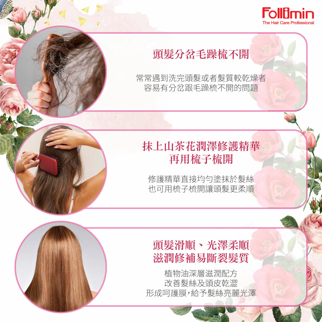柔順潤澤髮絲防止髮絲毛躁分岔、乾裂